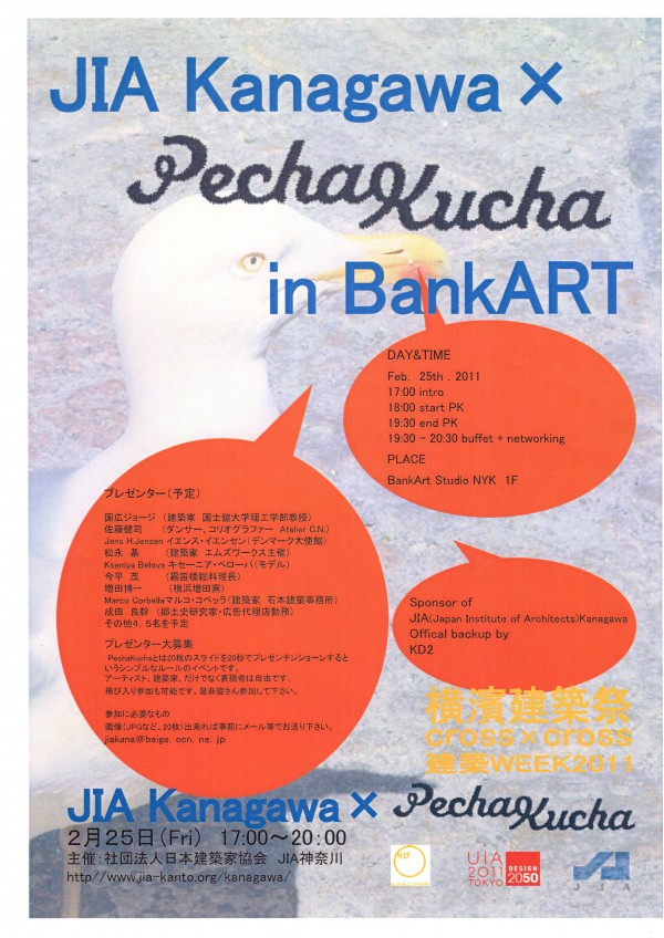 2011年2月25日、BankART Studio NYKで開催された、日本建築家協会(JIA)主催の「横濱建築祭―建築WEEK 2011」の「JIA Kanagawa×Pecha Kucha」プレゼンテーターとして参加しました。