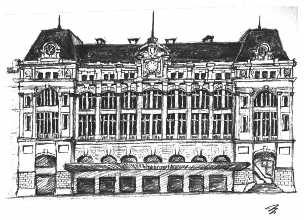 駅を出て駅前のロータリーからサン・ラザール駅を見上げる。モネのこよなく愛した駅である。いや、彼が愛したのは気煙と轟音を上げて走り回る近代の象徴=蒸気機関車の方であったのかもしれない。駅に向かって右側に場所をとり、スケッチを始める。シンプルでシンメトリーに整った駅舎は描いていてこころが躍る。反復される窓のファサード。何気なく配される天井下の彫刻。そして大きく広がる薄緑色の摺りガラスのエントランス。