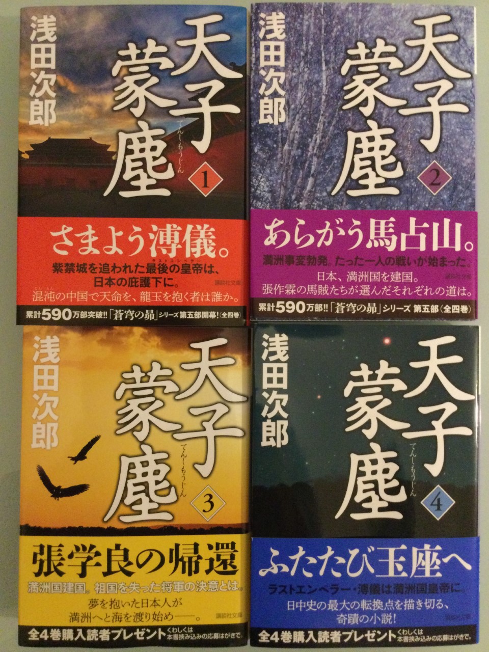 「蒼穹の昴シリーズ」と呼ばれる一連の中国近代史小説の最新作。清朝末期を描いた『蒼穹の昴』は正直なところ第一巻の半ばで挫折してしまった。浅田次郎の「壮大な構想」に思い至ることもなく、余り興味を持てない清朝の科挙や宦官が登場する「導入部」に倦んでしまったのである。その私が本著を敢えて手にしたのは、満洲国建国に至る日中の確執、正確に言えば「眠れる獅子」中国に巣食い侵略を進めていった帝国日本の「暴走」に興味を抱いているからであった。この『天子蒙塵』は正に、紫禁城を追われた後、関東軍により満州帝国の皇帝に担ぎ上げられていくラスト・エンペラー・溥儀を「軸」に物語が展開していく。