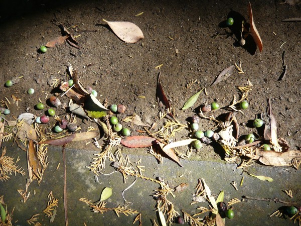 オリーブに似た卵型の実が落ちている。爪で傷つけてみると脂が沁み出てくる。