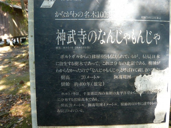 昭和59年に選定された「かながわの名木100選」というのがある。県内の簡単なハイキングコースなどを歩いているとたまに遭遇する古木である。子供の頃から歩き慣れた「神武寺・鷹取山ハイキングコース」を歩いて、ある11月、荘厳な神武寺境内・薬師堂の門を潜った。鬱蒼とした森の中に幹の周囲4メートルもある「神武寺のなんじゃもんじゃ」を見つけたのは、その名木100選の銘板によるものである。