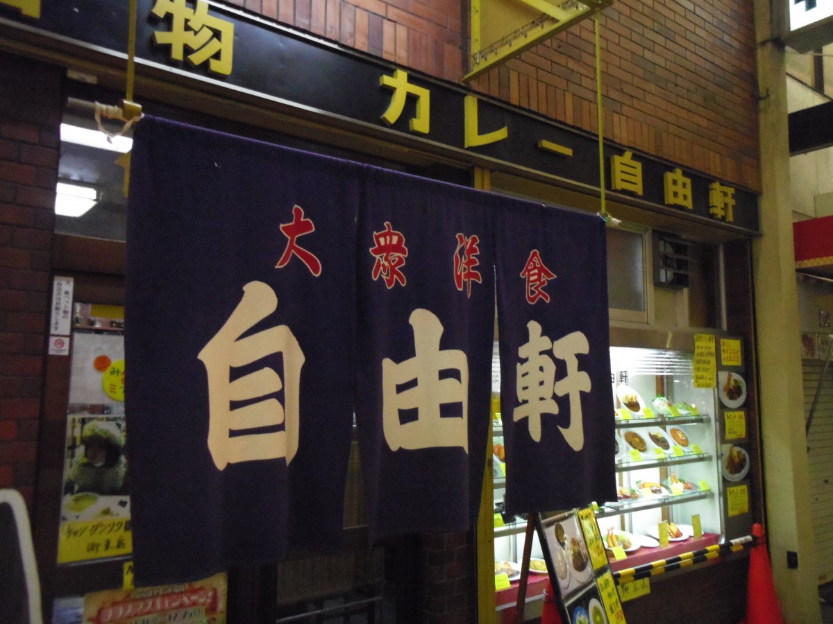 この柳吉の 「うまいもん」 に対する考え方は、ミナミ界隈を渉猟していると、概ね大阪人一般を代表しているように思える。そんな中でも、具体的な情景描写とともに登場するのが 「楽天地横」 の 「自由軒」の 「玉子入りのライスカレー」 であって、柳吉の吃音の口上を借りれば、「自由軒(ココ)のラ、ラ、ライスカレーはご飯にあんじょうま、ま、まむしてあるよって、うまい」…となる。早速、現在は 「なんばグランド花月」 にほど近い 「自由軒」 本店の暖簾を潜る。