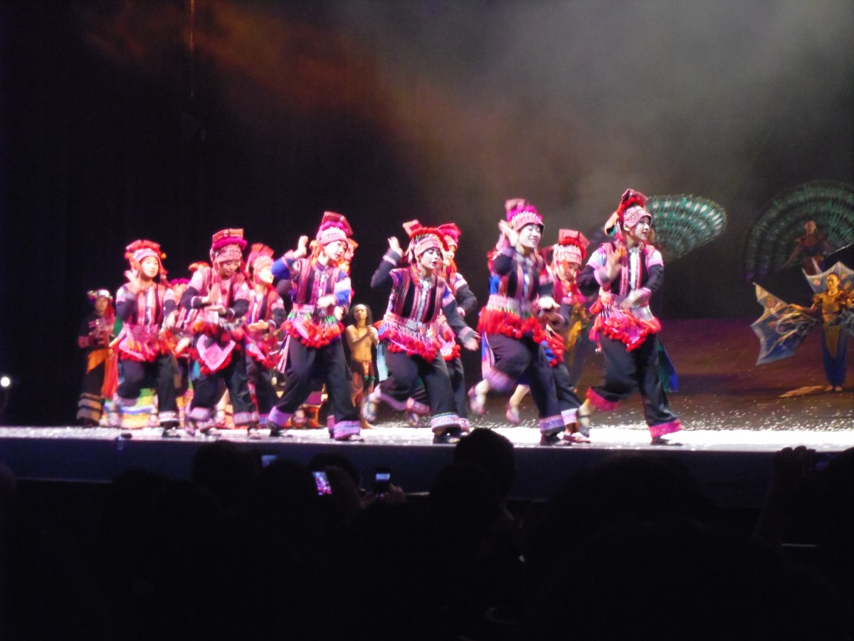 舞台は、ワ族、イ族、ペー族、タイ族、そしてチベット族と、それぞれの少数民族が原色の民族衣装を纏い、永年に亘って培ってきた歌と踊りで構成されており、まさに色彩と躍動の百花繚乱である。それは、祭礼の歌舞であったり、農作業の歌舞であったり、そして男女の出会いの歌舞であったり、人間の根源的ともいえる原初の活動が生き生きと描かれている。そしてイ族の若い男女の群が舞う「打歌」には、何処か日本の「はないちもんめ」に似た懐かしささえ感じるのだ。