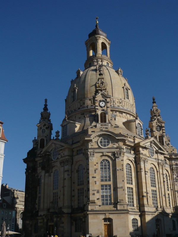 ドレスデンは、1945年、連合軍により壊滅的な爆撃を受けた。街の広場の中心に聳え立っていたその象徴ともいえる聖母(フラウエン)教会も、この空襲により瓦解し、焼け焦げた石の瓦礫の山と化した。この石の山は戦後放置されたが、1990年の東西ドイツ統合のシンボルとして再建計画が立てられ、空襲によりこれを破壊した旧連合国や日本の財政・技術支援を受けて2005年に再建を果たした。その壁面にはポツポツと痘痕のような黒い石が散見されるが、これはコンピュータを利用して、瓦解した石の形から原型で使用されていた部分を特定し、再建された石組みの一部としてそのまま活かされているためである。