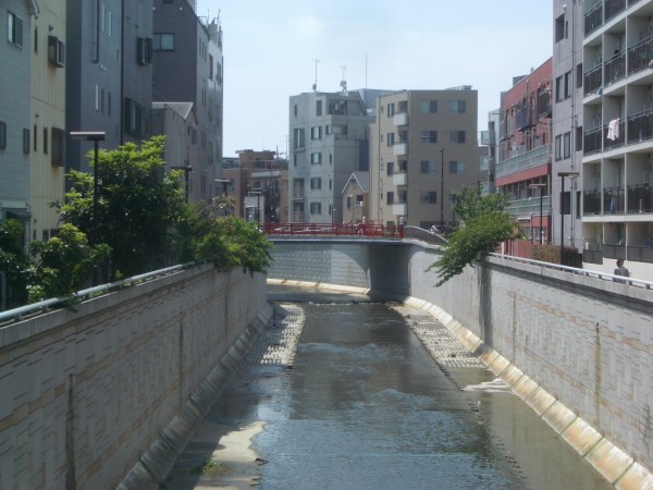 東中野から淀橋に至る見慣れた川沿いの桜は、既に夏日を受けて蒼々と葉を繁らせている。だが、淀橋を過ぎると河岸は緑を失い高層ビルに囲まれる乾いた「都会の川」に変貌する。暫くは殺風景な風景が続くが、そこで安堵を与えてくれるのが「中野新橋」だ。赤い橋桁は2011年9月に架け替えられたばかりだが、古い写真と見比べても意匠の変化はない。昭和初期以降、花柳界として栄えた街のシンボルとしての存在感を保っている。
