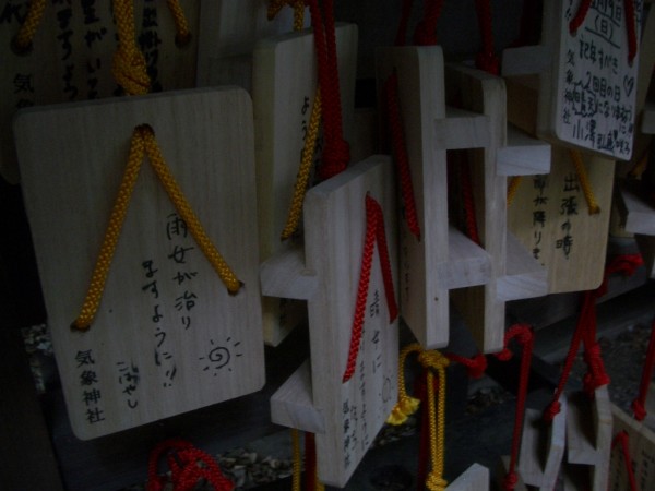 軍用道路を一旦、終点の天沼、日大二中・二高まで突き当たると、踵を返して、高円寺南にある氷川神社の境内に移設された「気象神社」を訪ねてみることにした。深い杜に囲まれた昼尚暗い氷川神社の社殿を見通す石鳥居の右脇に、小さな鳥居がある。日本で唯一と言われる、気象予報の神様だけあって、奉納されている絵馬が「下駄」の形をしているのがユニークだ。絵馬に書かれている祈願は、商売がらみの晴天祈願が多いのだが、気象予報士の合格祈願や、雨男・雨女の返上祈願などというものもあって面白い。
