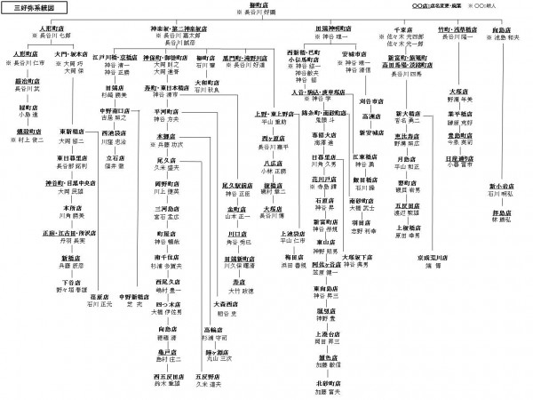 ※ 本系統図は、「食べログ」に掲載されている、「三好弥・上板橋店」に掲げられている写真を模写した。また、同店舗に掲げられている週刊誌記事「屋号の探検」に掲載された「三好弥」を参考に記載している。