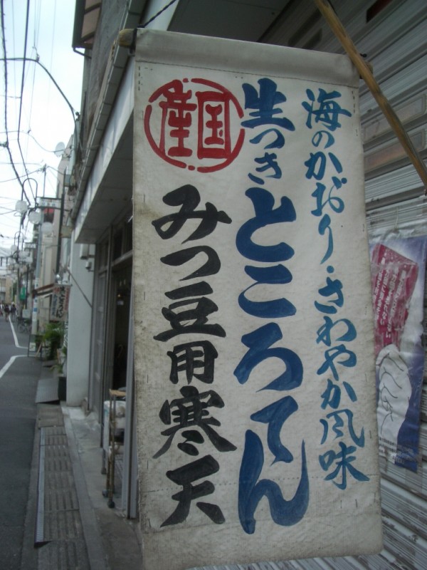 次にご紹介するのは、大宮八幡宮から鷺宮八幡に至る古道の風情をそのまま残した、松山通り商店街(阿佐ヶ谷北)の「あの店」である。「すでに、これは詩である」と言った「海のかおり・さわやか風味、生つきところてん・みつ豆用寒天」の幟が気になって、後日改めて訪ねてみた。この店は実はこんにゃく・寒天工場で、卸を商売にしている「都留食品加工有限会社」である。豆腐屋と同じく、朝早い仕事のようで、土曜の昼前に尋ねても店頭に人はおらず、インターホンで呼び出す。働き者で芯の通ったおばさんに寒天を3本出してもらい、ついでに店頭の赤豌豆の缶詰と黒蜜を求めた。