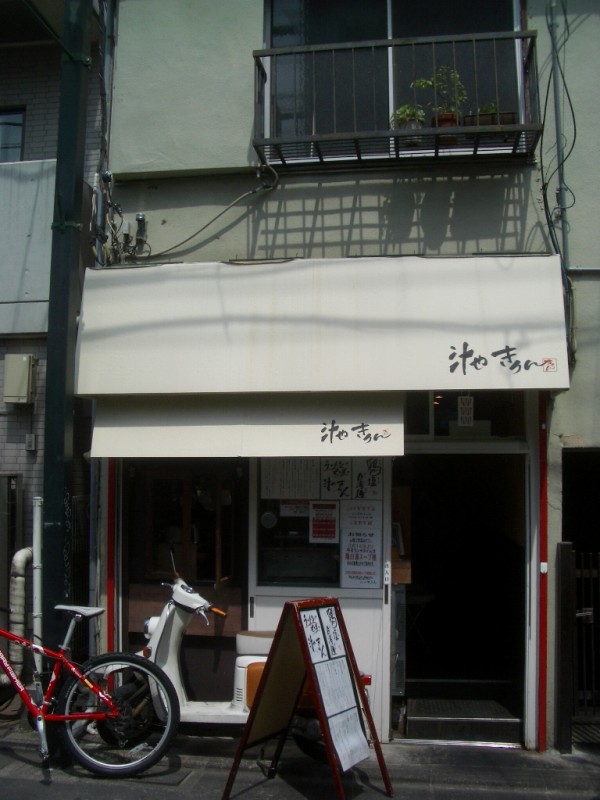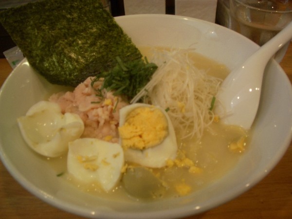 こうしてシンチェリータに通うようになって、ふと隣の「汁やきりん」から漂ってくる鶏だしの白湯の匂いにそそられた。既に老躯には辛いこってり系のラーメンではないか、という一縷の不安と疑念を抱きながらも暖簾を潜ると、僅か8名ほどのカウンターに既に客がひしめいている。一押しの鶏塩白湯麺は、つけ麺だしと見紛う濃さに鶏だしを煮詰めたものだが、臭くなく鶏だしの旨味が白く凝縮している。店の名に「汁や」と銘打つ自慢のつゆと言っていい。ゆで卵がタダでつくので、殻をむき無骨に割ってこの濃いつゆとともに頂くと、鶏たたきに近い新鮮な裂き身と白髪葱とのコラボにも絶妙なものがある。