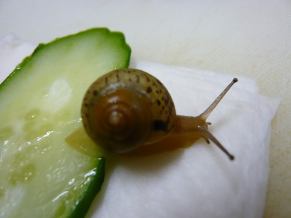 それから毎朝、小さなジップロックの容器の底に紙のキッチンタオルに水を浸ませたのを敷き、薄切りの胡瓜を載せて、三つ葉や紫蘇といった薄手の葉物を置き、蓋の代りにガーゼを掛けて蝸牛の世話をするのが日課となった。米粒ほどの巻貝を背負った蝸牛の幼虫を胡瓜の断面に載せてやると、小さいながらもツノを出して食事を始めるのが、いとおしい。