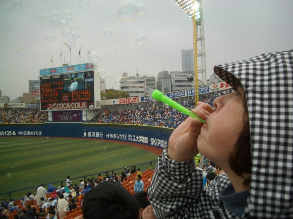思えば、プロ野球の声援も童心に戻ること。更にこの「シャボン玉」アトラクションがその童心回帰に拍車を掛けてくれる。シャボン玉を飛ばしたのなんて、何年ぶりだろうか、と考えながら、空高く舞い上がるシャボン玉の群れの圧巻にただ見とれている。ベイスターズの戦果も「泡沫」に帰すことなきことを願いながら、しばしシャボン玉に覆われるベースターズ・ファンの一人として佇んでいた。どうですか?貴方も一緒に、横濱スタジアムで「シャボン玉飛ばそ」。