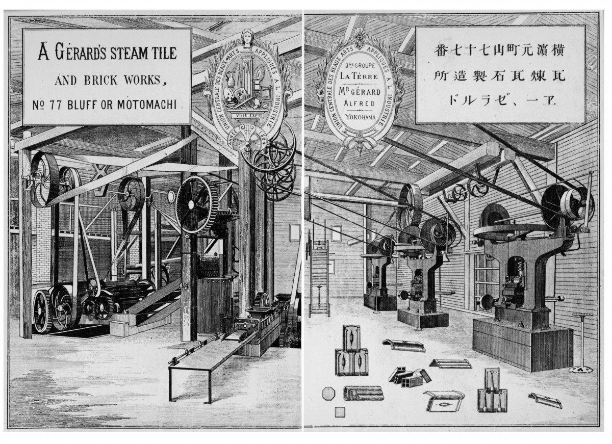 A. ジェラールは「船用最上飲用清水」の販売で初期資本を蓄積すると、水屋敷の上屋に建造された工場で、明治6年頃からフランス瓦と煉瓦の製造を始める。山手外国人居留地における洋館の建設にこの瓦と煉瓦が重要な役割を担ったことは言を俟たない。その瓦は関東大震災の際に瓦解した東京の洋館跡からも、そして遠くは佐倉市の歩兵連隊の建築物跡からも発見されており、欧化政策下の日本の都市景観の一部を彩ったに違いない。明治10年代に、この瓦・煉瓦工場に西欧から輸入された最新式の蒸気機関による量産システムが導入されていることは、明治19年に発行された 『横濱諸会社商店之図』 という銅版画の、ジェラール工場の内観図からも分かる。近代化の工業技術もこの元町の谷合にその萌芽があったということになる。